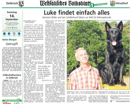 In der Ausgabe vom 14.09.2013 des Westfälischen Volksblattes wurde über Hermanns und Lukes erfolgreiche Qualifitkation zur Rettungshundemeisterschaft berichtet.