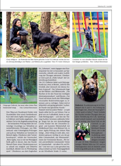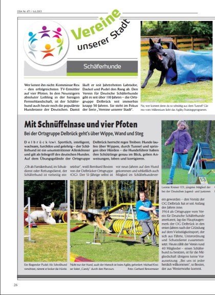 Wüseke, Christina: Vereine unserer Stadt. Mit Schnüffelnase und vier Pfoten, in: Delbrücker Stadtanzeiger (06.06.2013) Nr. 471, S.26f.
